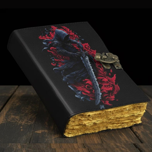 สมุดบันทึกหนังลายพิมพ์ Crimson Reaper สไตล์โกธิค แฟนตาซีดาร์ก หนังสือปีศาจ