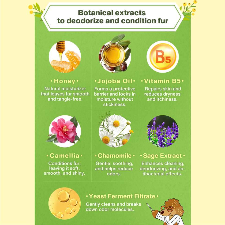 Features:Cleans & smoothens pet fur while eliminating odor, grease & dirt