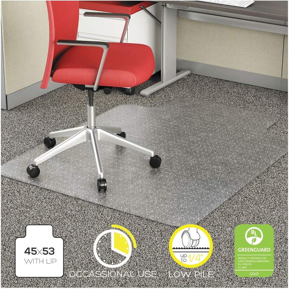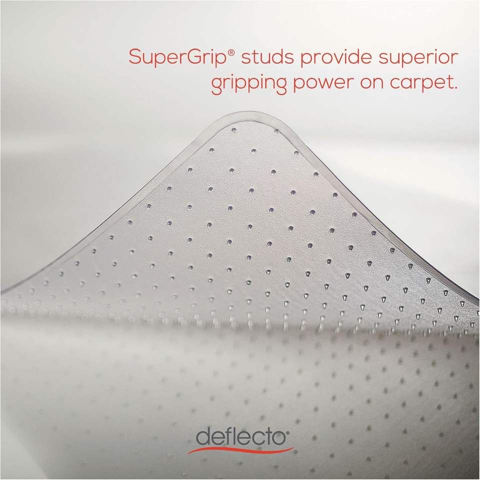 แผ่นรองเก้าอี้ Alera Modern Studded สำหรับพรมขนสั้น ขนาด 45 นิ้ว x 53 นิ้ว ผลิตจาก PVC ไวนิล PET ล้างทำความสะอาดได้ พร้อมขอบใส สำหรับใช้ในสำนักงานและห้องนั่งเล่น