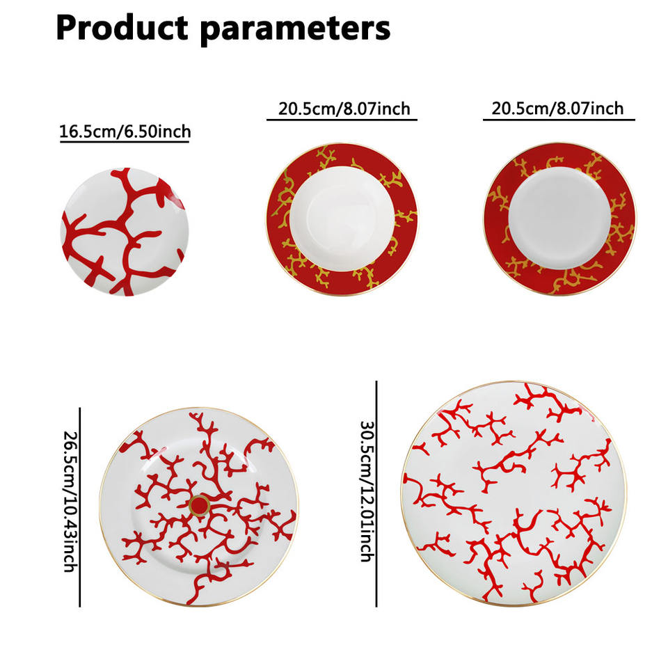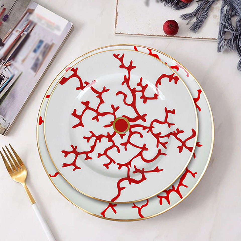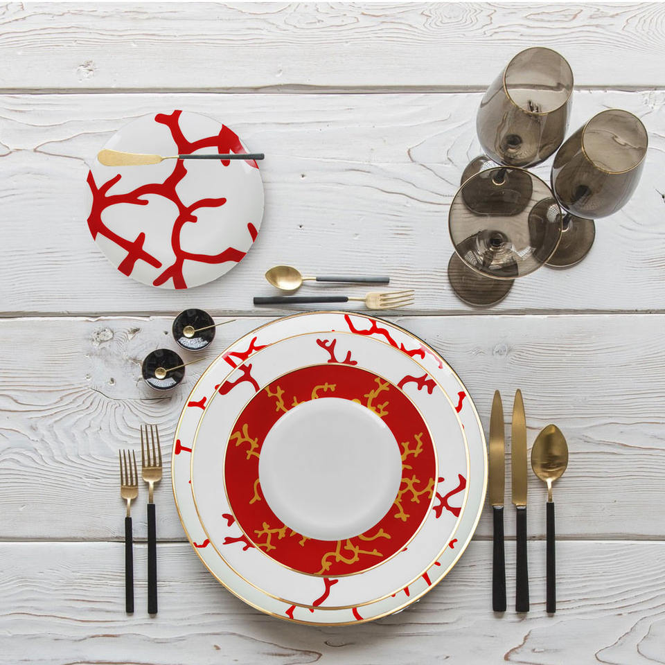 ชุดอาหารค่ำหรูหราจากโรงงานอัลฟ่า ผลิตจากกระดูกจีน จานรองสีแดง สำหรับงานแต่งงาน ขอบสีทอง เป็นมิตรกับสิ่งแวดล้อม ดีไซน์เรียบง่ายทันสมัย