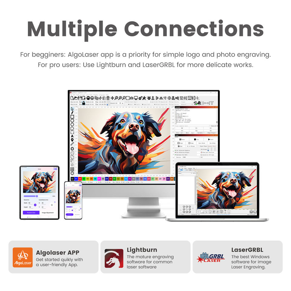 ระบบควบคุมยี่ห้อ:LightBurn, LaserGRBL, AlgoLaser APP, หน้าจอ IPS ขนาด 3.5 นิ้ว