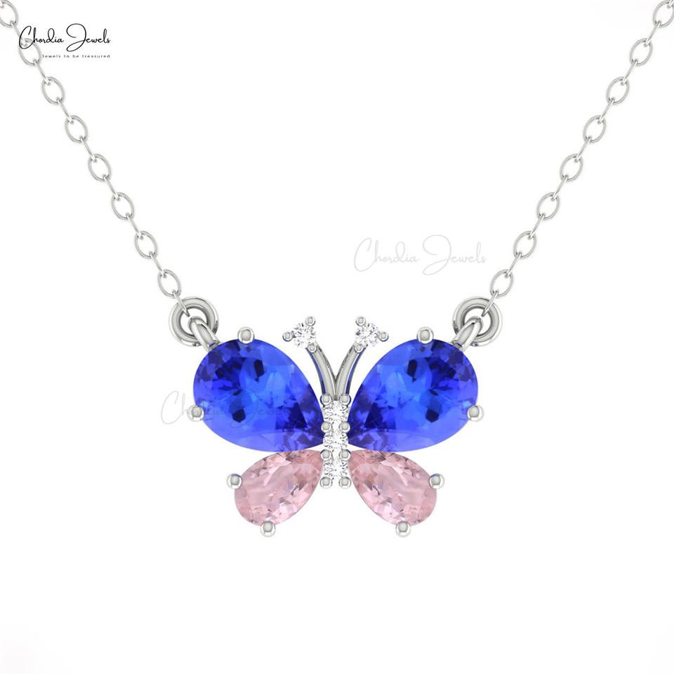 ผู้ขายที่ได้รับการยืนยันจากอาลีบาบา สร้อยคอรูปผีเสื้อประดับพลอยแทนซาไนต์สีน้ำเงิน 1.26 กะรัต และพลอยมอร์แกไนต์สีชมพู ทองคำแท้ 14K ประดับเพชร เครื่องประดับสำหรับผู้หญิง