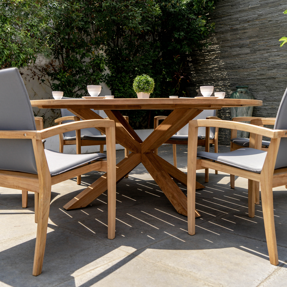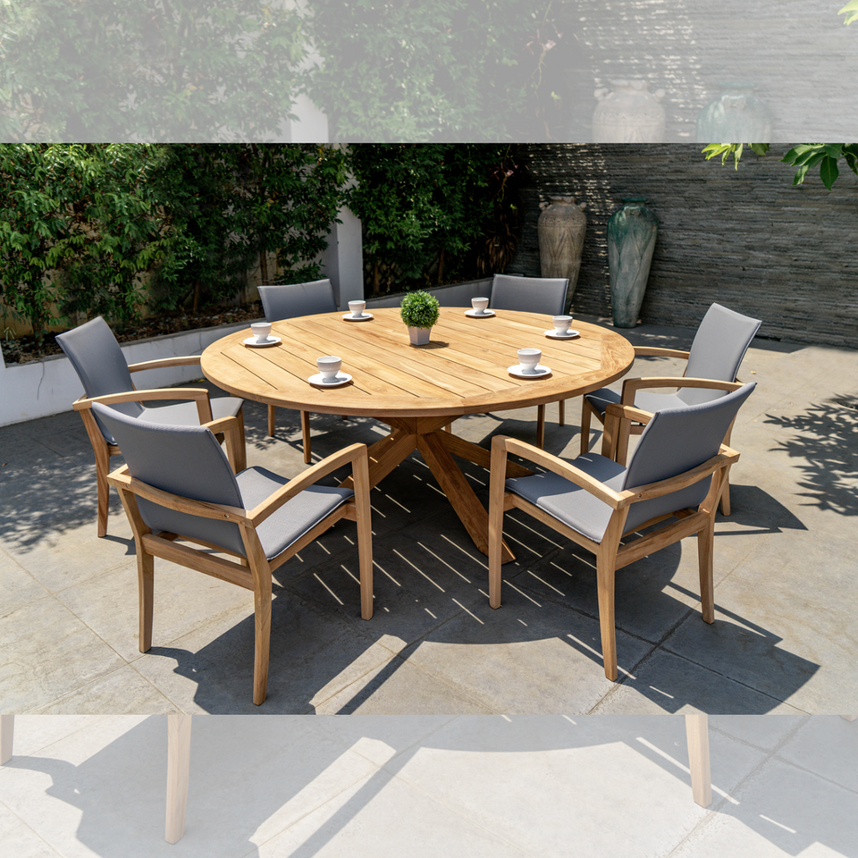 ชุดโต๊ะรับประทานอาหารกลางแจ้งทรงกลม Alifa พร้อมเก้าอี้แบบซ้อนได้ ทำจากไม้สักแท้ ผิวสัมผัสธรรมชาติ สำหรับใช้รับประทานอาหารทั้งในร่มและกลางแจ้ง