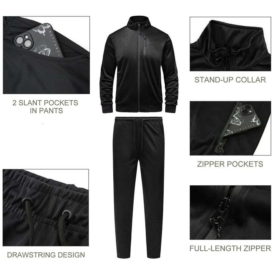 ชุดวอร์มผ้าโพลีเอสเตอร์สำหรับผู้ชายชุดวอร์ม2ชิ้นสำหรับใส่วิ่งออกกำลังกายสีดำล้วนไซส์ใหญ่