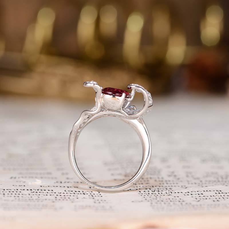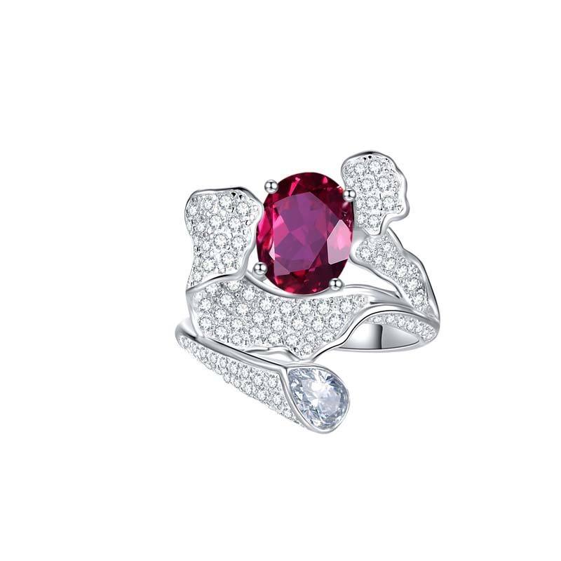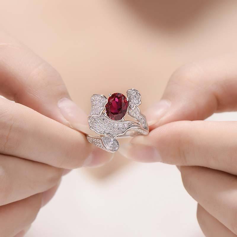 แหวนแฟชั่นอัญมณีรูบี้ทรงรี 2 กะรัต ผลิตในห้องปฏิบัติการ วัสดุหลักทำจากซิลิโคน ประดับด้วยเครื่องประดับที่สร้างขึ้นในห้องปฏิบัติการ