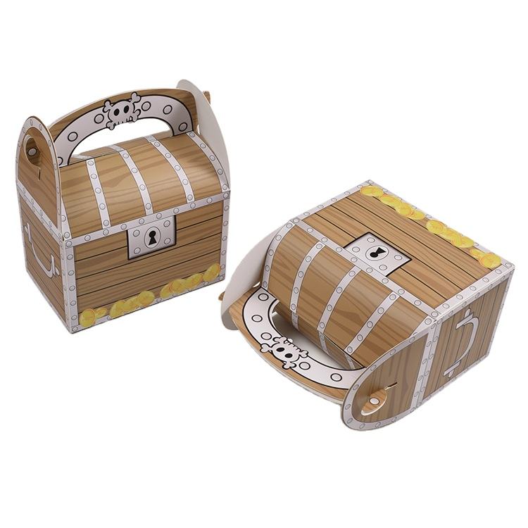 หีบสมบัติโจรสลัดทรงสี่เหลี่ยมขนาด7*11*7ซม. กล่องกระดาษขนมลายไม้ช็อคโกแลตกล่องใส่กระดาษสีทอง