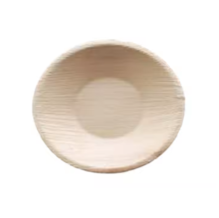 แผ่นใบปาล์ม Areca ทรงกลมขนาด5นิ้วแบบใช้แล้วทิ้งสำหรับเสิร์ฟขนาดเล็กในงานปาร์ตี้งานกลางแจ้งสีเขียว