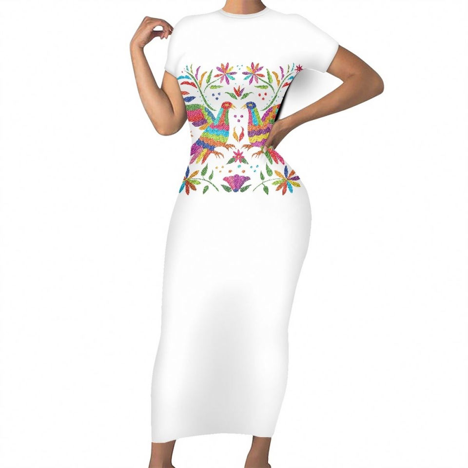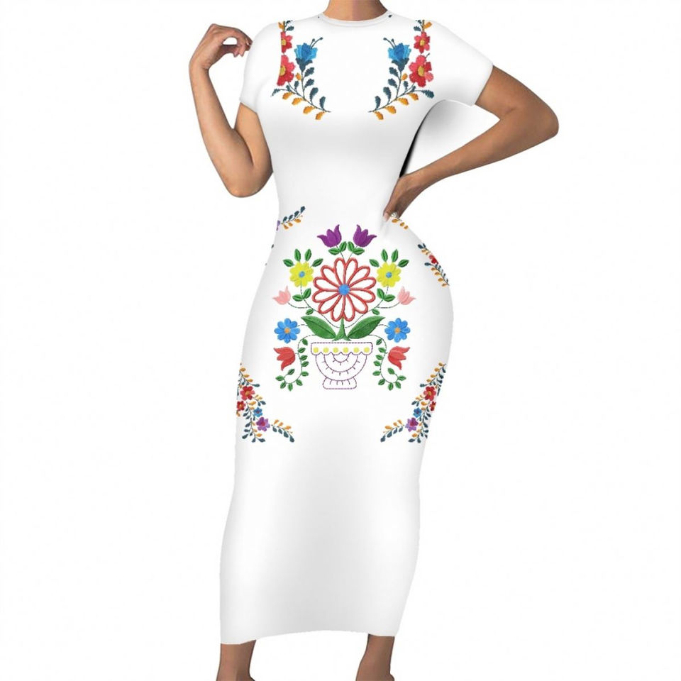 ชุดเดรสทรงเข้ารูปแขนสั้นพิมพ์ลายทั่วตัว ออกแบบปักลายสไตล์เม็กซิกัน เสื้อผ้าศิลปะพื้นบ้าน