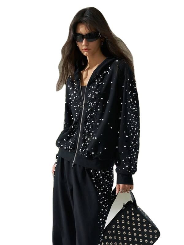 เสื้อฮู้ดประดับพลอยเทียมสำหรับผู้หญิงเสื้อกันหนาวขนแกะผ้าเฟรนช์เทอร์รี่มีซิปสีดำสำหรับสตรีทไซส์ใหญ่พิเศษเสื้อแจ็คเก็ต100% ผ้าคอตตอน330GSM