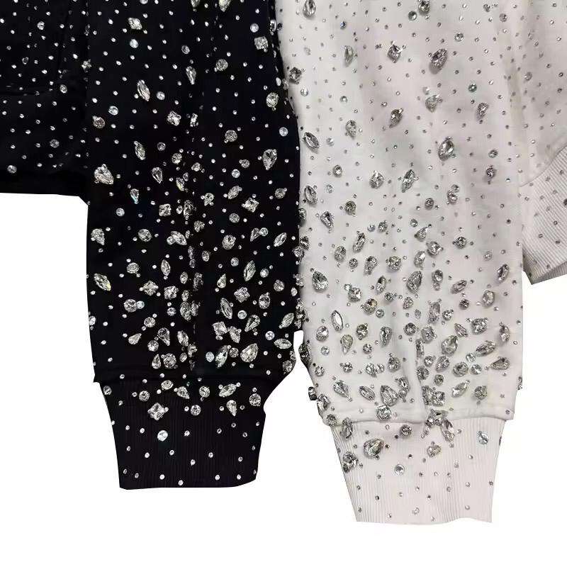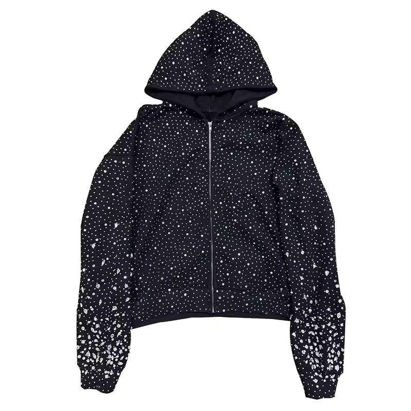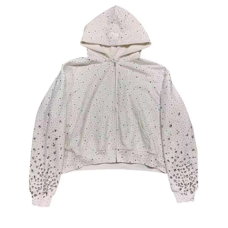 เสื้อฮู้ดซิปประดับคริสตัลวิบวับ ทรงโอเวอร์ไซส์ สไตล์สตรีทแวร์ ผ้าฟลีซ ปักโลโก้ได้ตามต้องการ สำหรับผู้ชาย