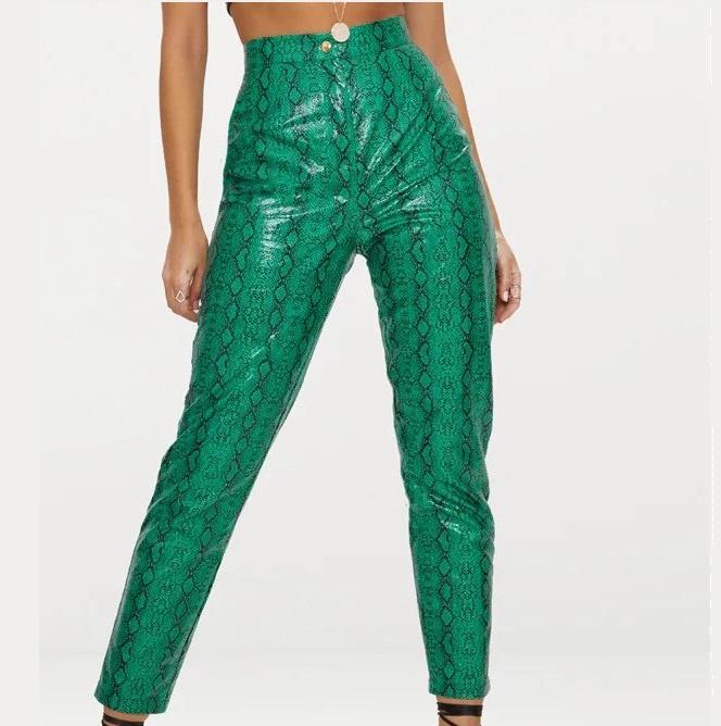 กางเกงหนังลายหนังงูสนิมทั้งตัว หนังแท้คุณภาพสูง ทรงสกินนี่รัดรูป ขาบานทรงหลวมสำหรับผู้หญิง