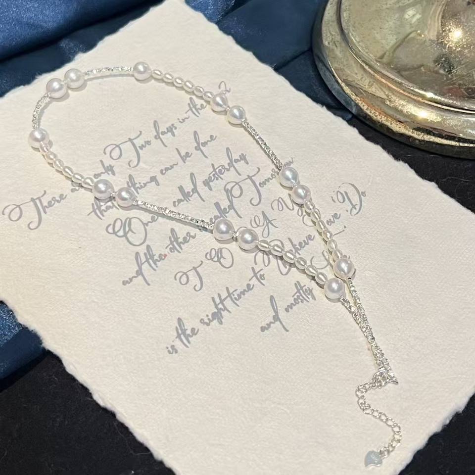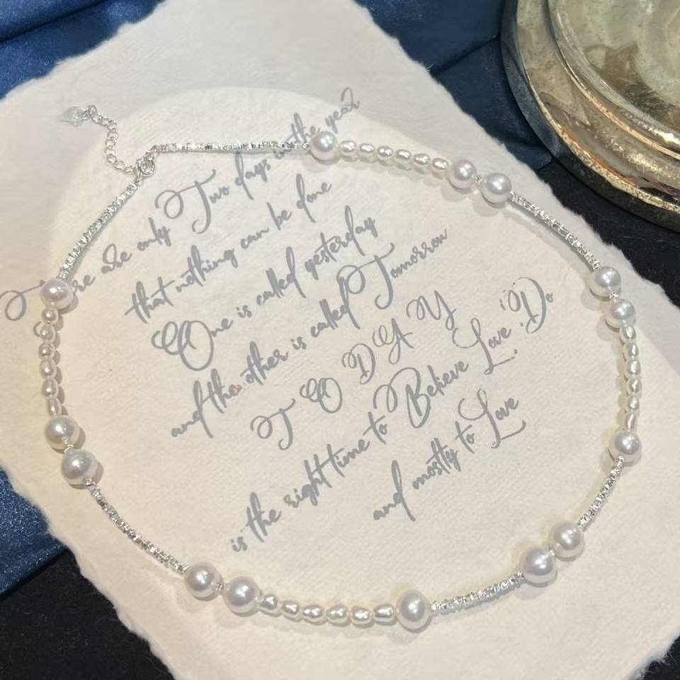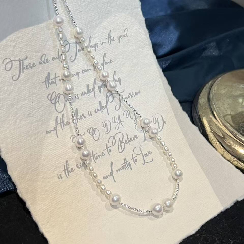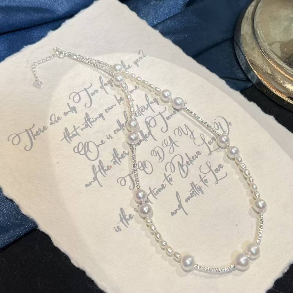 สร้อยคอท้องฟ้าเต็มดาว ประดับด้วยไข่มุกอะโกย่าน้ำจืดแสงสว่าง ตัวเรือนเงินแท้ S925 ดีไซน์ท้องฟ้าเต็มดาวแบบเงินแตก 7-8 มม.