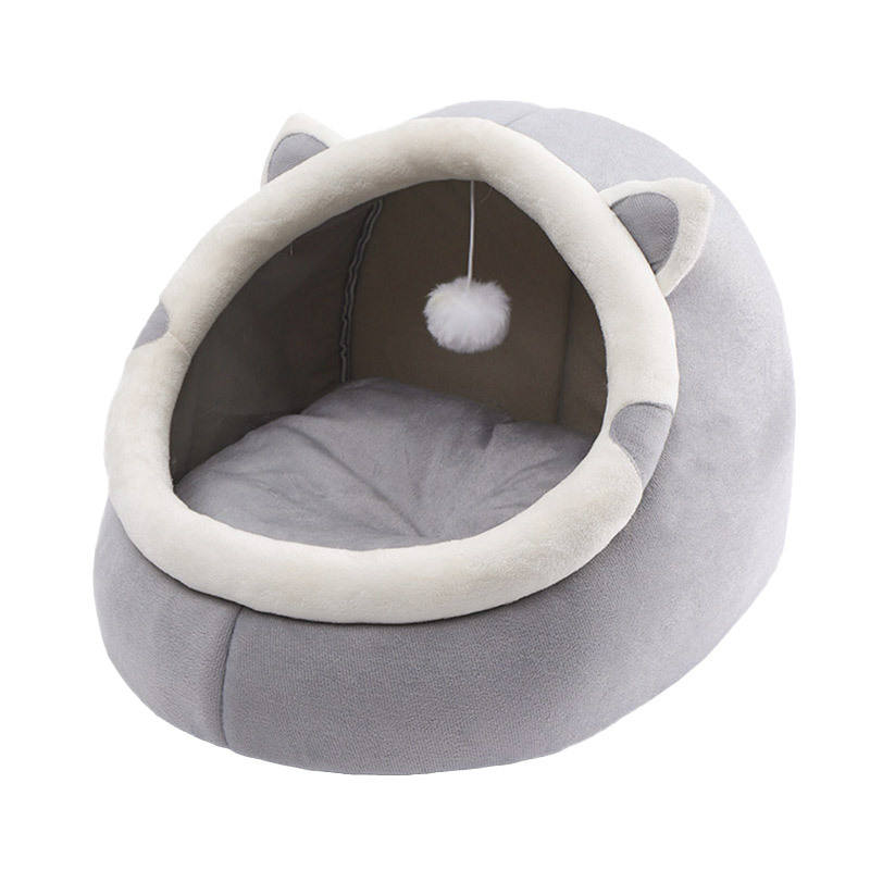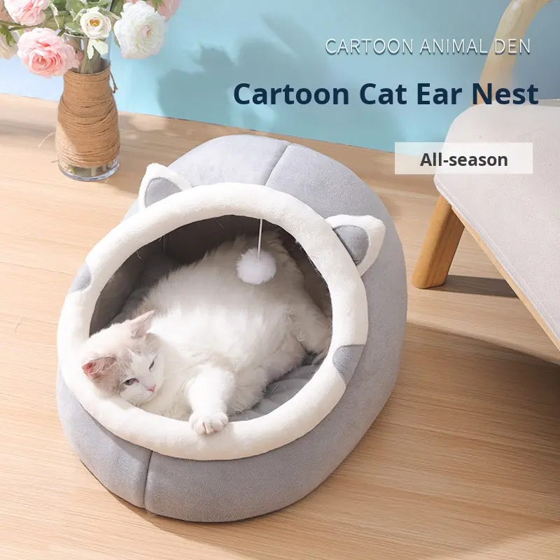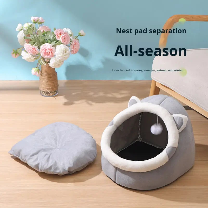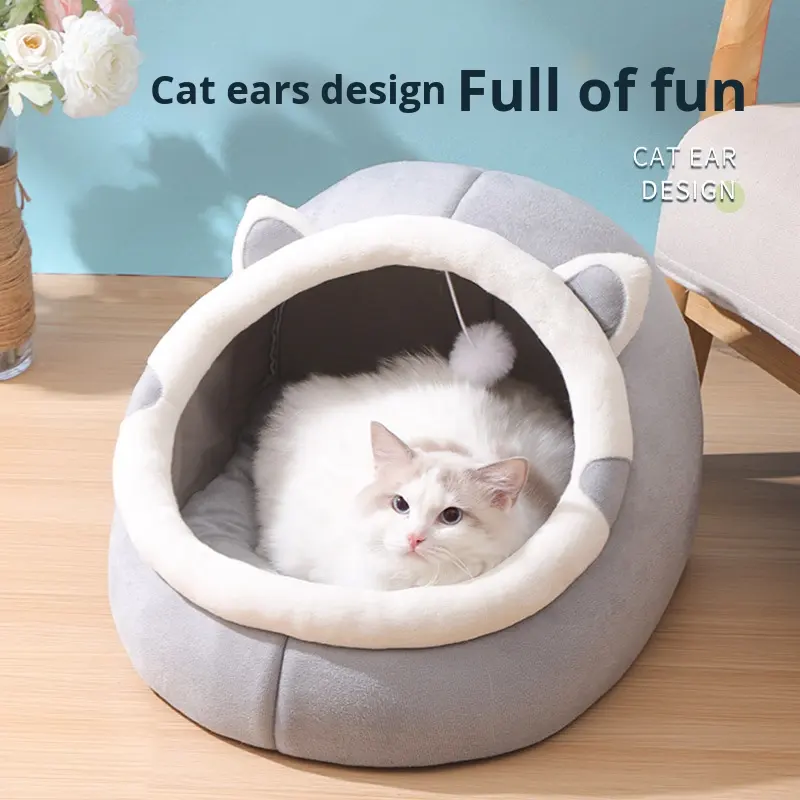 บ้านแมวแบบกึ่งปิดล้อมทุกฤดูบ้านสุนัขอบอุ่นลายทางระบายอากาศได้ดีเตียงสัตว์เลี้ยงแบบแข็งสำหรับใช้ตลอดทั้งปี