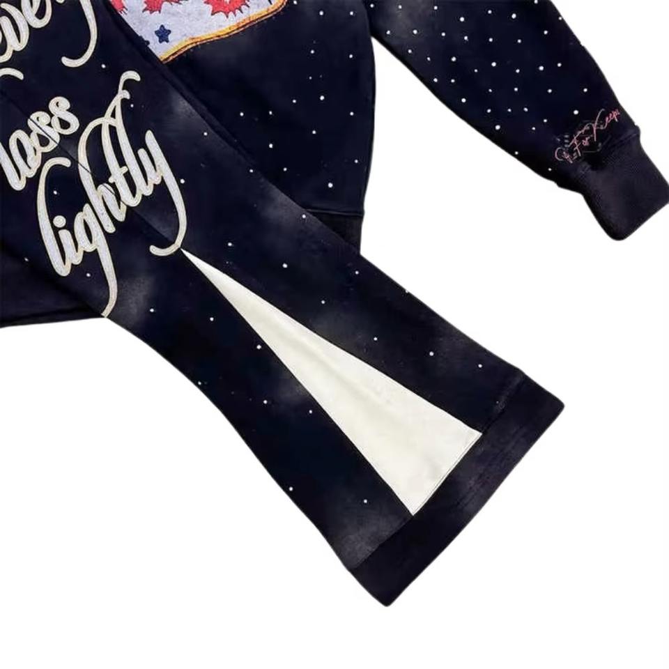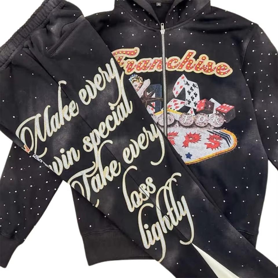 ชุดวิ่งมีฮู้ดยูนิเซ็กส์ทุกฤดูชุดวอร์มสองชิ้นผ้าฟลีซพิมพ์ลายวินเทจ