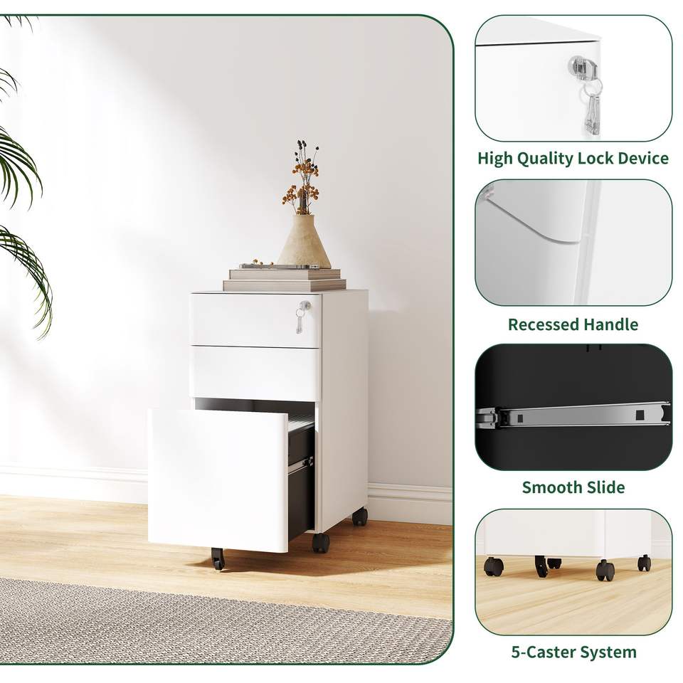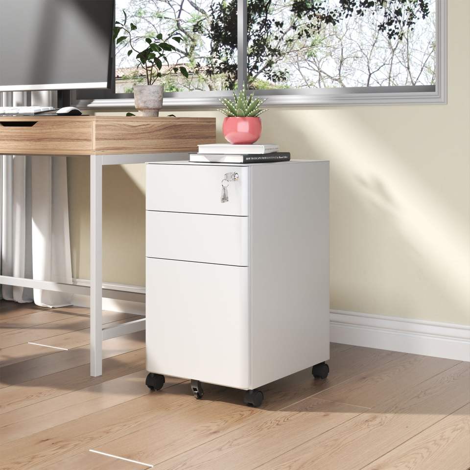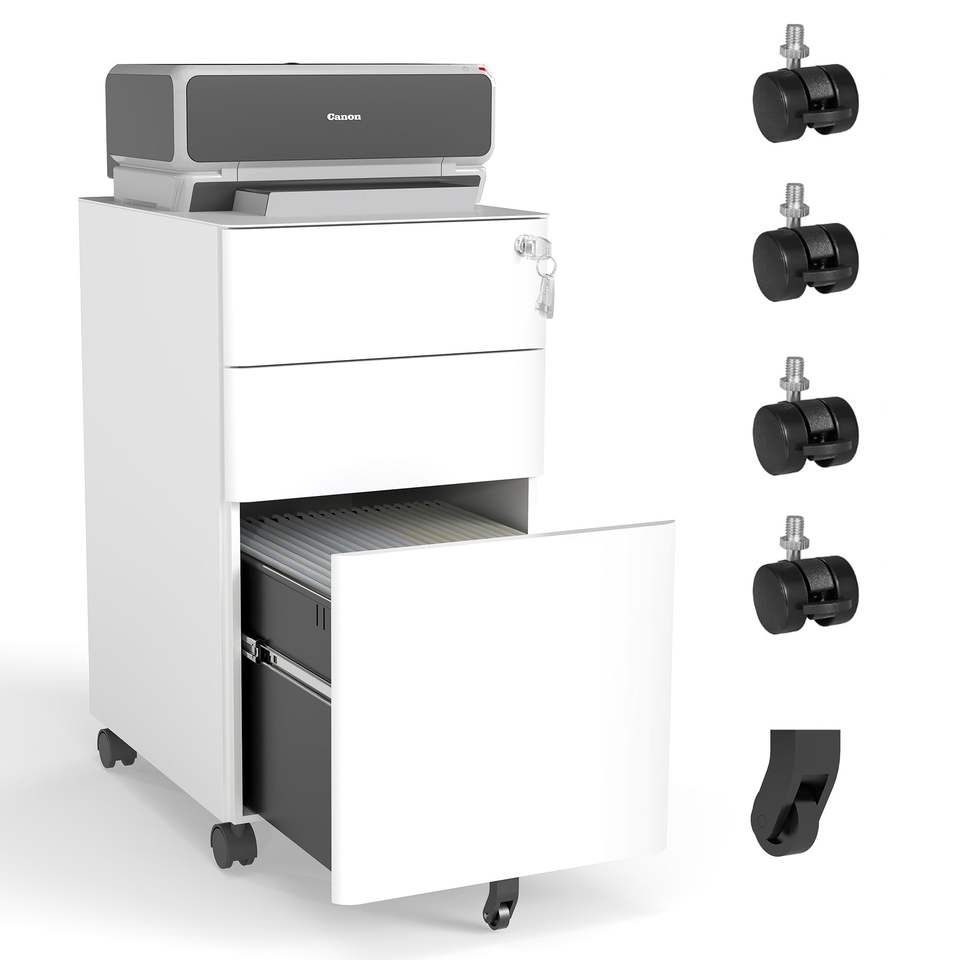 ตู้เก็บเอกสารเหล็กเคลื่อนที่พร้อมกุญแจล็อค 3 ลิ้นชัก - สองลิ้นชักตื้นและหนึ่งลิ้นชักลึก พร้อมล้อเลื่อนสำหรับใช้ในสำนักงาน/ที่บ้าน