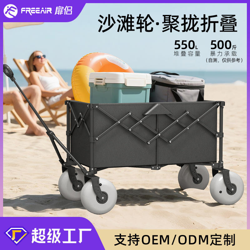 รถเข็นแคมป์ปิ้งอเนกประสงค์ ล้อบอลลูนสี่ล้อ ด้ามจับยืดหดได้ โครงเหล็กคาร์บอน สีเทา รับน้ำหนักได้ 500 กก. สำหรับใช้งานกลางแจ้ง