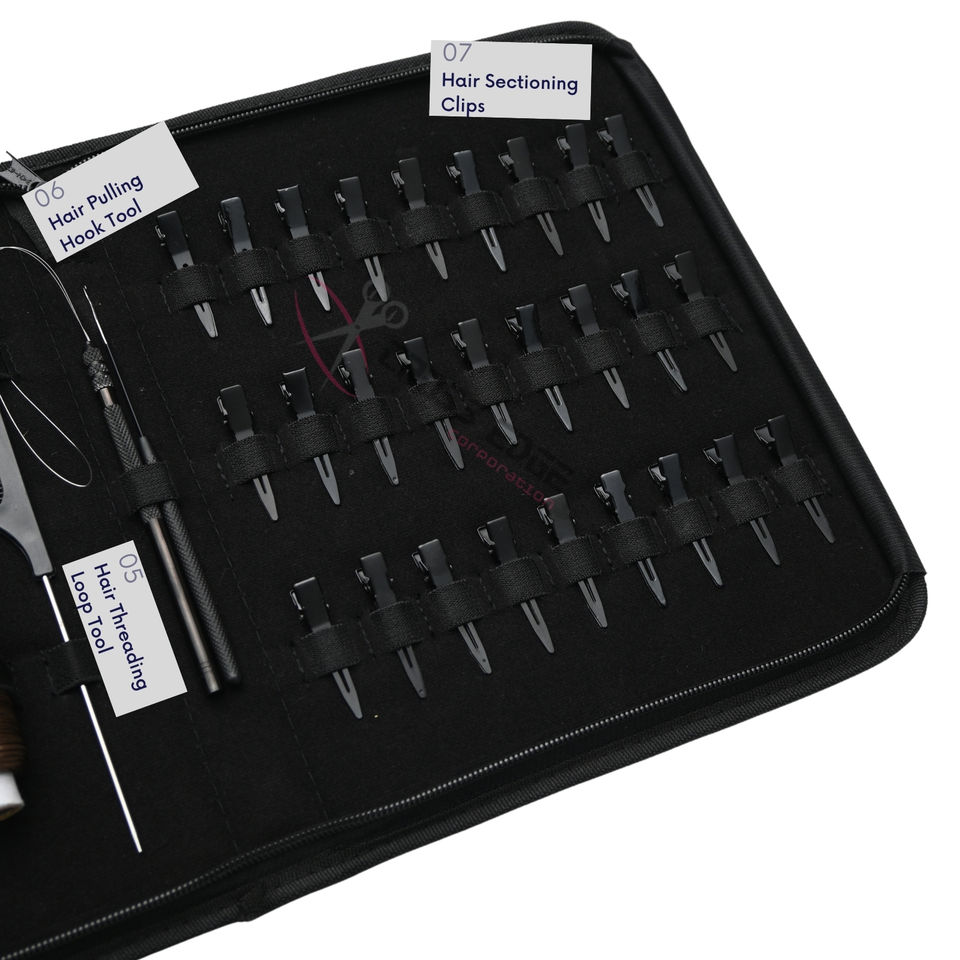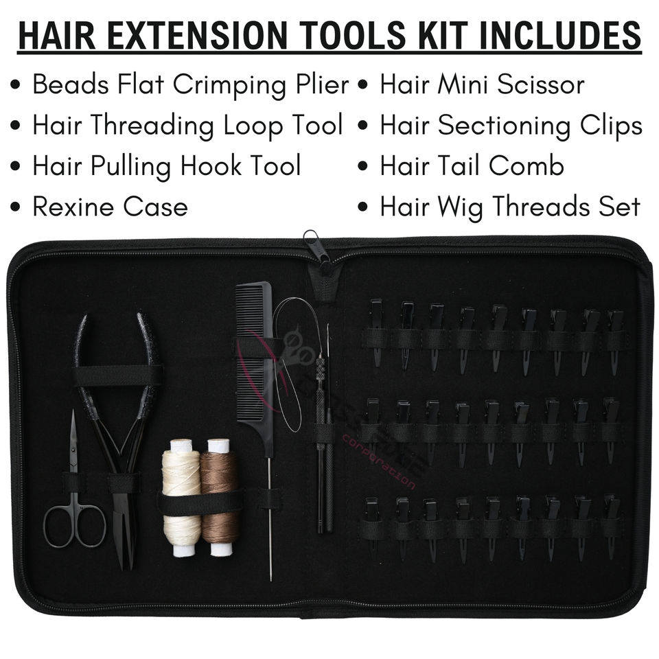 ชุดอุปกรณ์ต่อผมสีดำแบบออลอินวัน พร้อมคีมหนีบผมแบบแบน ที่ร้อยห่วง ที่ดึงผม ตะขอเกี่ยวผม กรรไกรขนาดเล็ก คลิปจัดแต่งทรงผม และหวี
