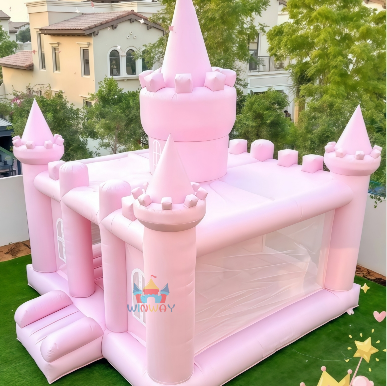 ปราสาทเป่าลมสีชมพูยักษ์แบบออลอินวันพร้อมสไลด์พีวีซีที่ทนทานเหมาะสำหรับงานแต่งงานสนามหลังบ้านสนุกอุปกรณ์สำหรับเด็กเล่นที่ปลอดภัย