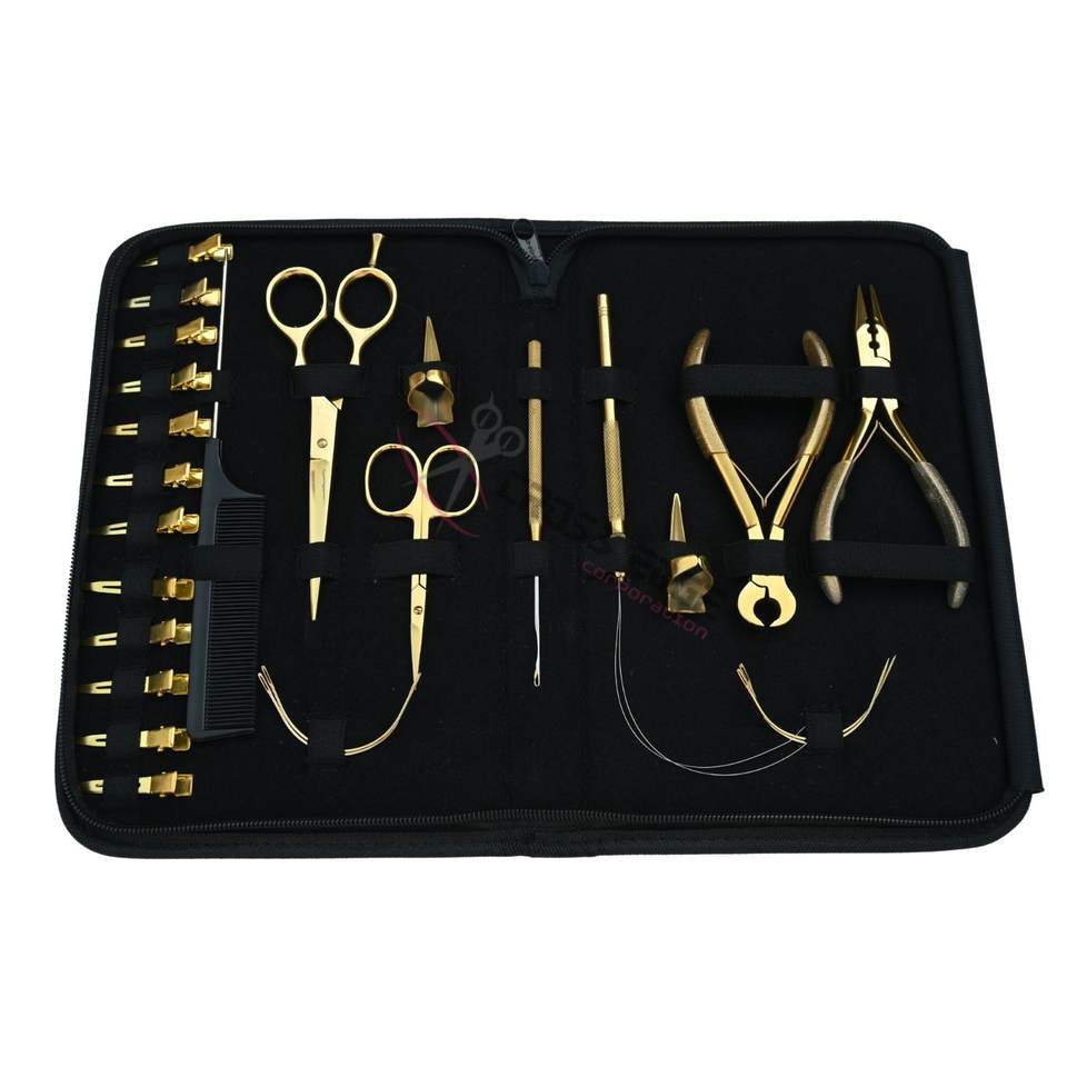 ชุดอุปกรณ์ต่อผมออลอินวันสีทอง พร้อมเครื่องมือ MicroLink Crimper, คีมถอดลูกปัด, คีมตัดกิ๊บ, เข็มเย็บผ้า และชุดนิ้วสำหรับแยกผม