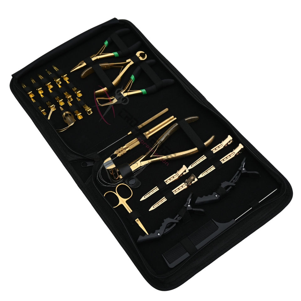 การใช้งาน:ชุดเครื่องมือสำหรับร้านเสริมสวย: คีมถอดลูกปัด, คีมย้ำ, ตะขอเกี่ยวเส้นด้าย, และห่วง, คีมถอดเทปต่อผมแบบไมโครบีดสีทอง เครื่องมือย้ำปลาย