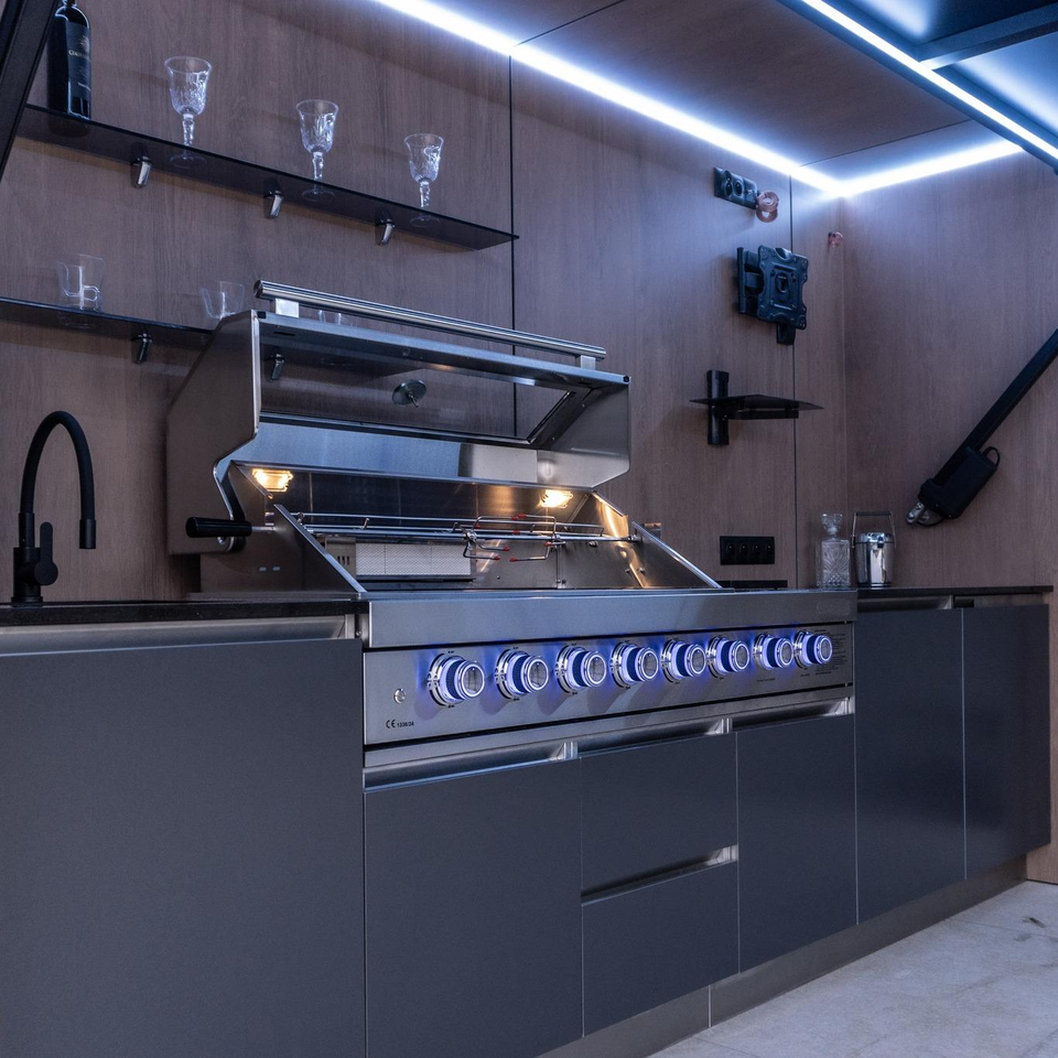 ครัวกลางแจ้งออลอินวันทันสมัยทำจากไม้โอ๊คแท้และสแตนเลส ทนแดด ทนน้ำ พร้อมเตาย่างแบบฝัง ทำความสะอาดง่าย เหมาะสำหรับพื้นที่พักผ่อนกลางแจ้ง