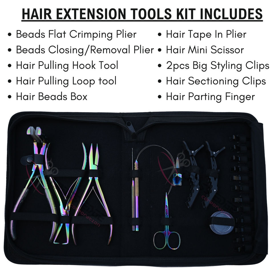 ชุดอุปกรณ์ต่อผมออลอินวันเรนโบว์ พร้อมคีมหนีบผมตรงขนาด 7 นิ้ว คีมติดเทป คีมถอดเม็ดบีด กรรไกรขนาดเล็ก กล่องใส่เม็ดบีด