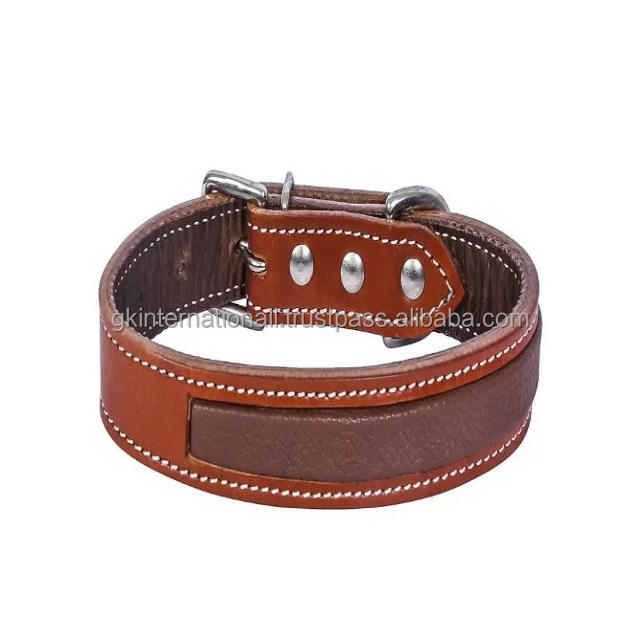 ปลอกคอหนังสำหรับสุนัขที่ใช้งานหนักทนทานทุกฤดูกาล,หนังสีน้ำตาลเม็ดเต็มแผ่นรองนุ่มพร้อมหัวเข็มขัดแบบลูกกลิ้งเย็บเต็มรูปแบบ