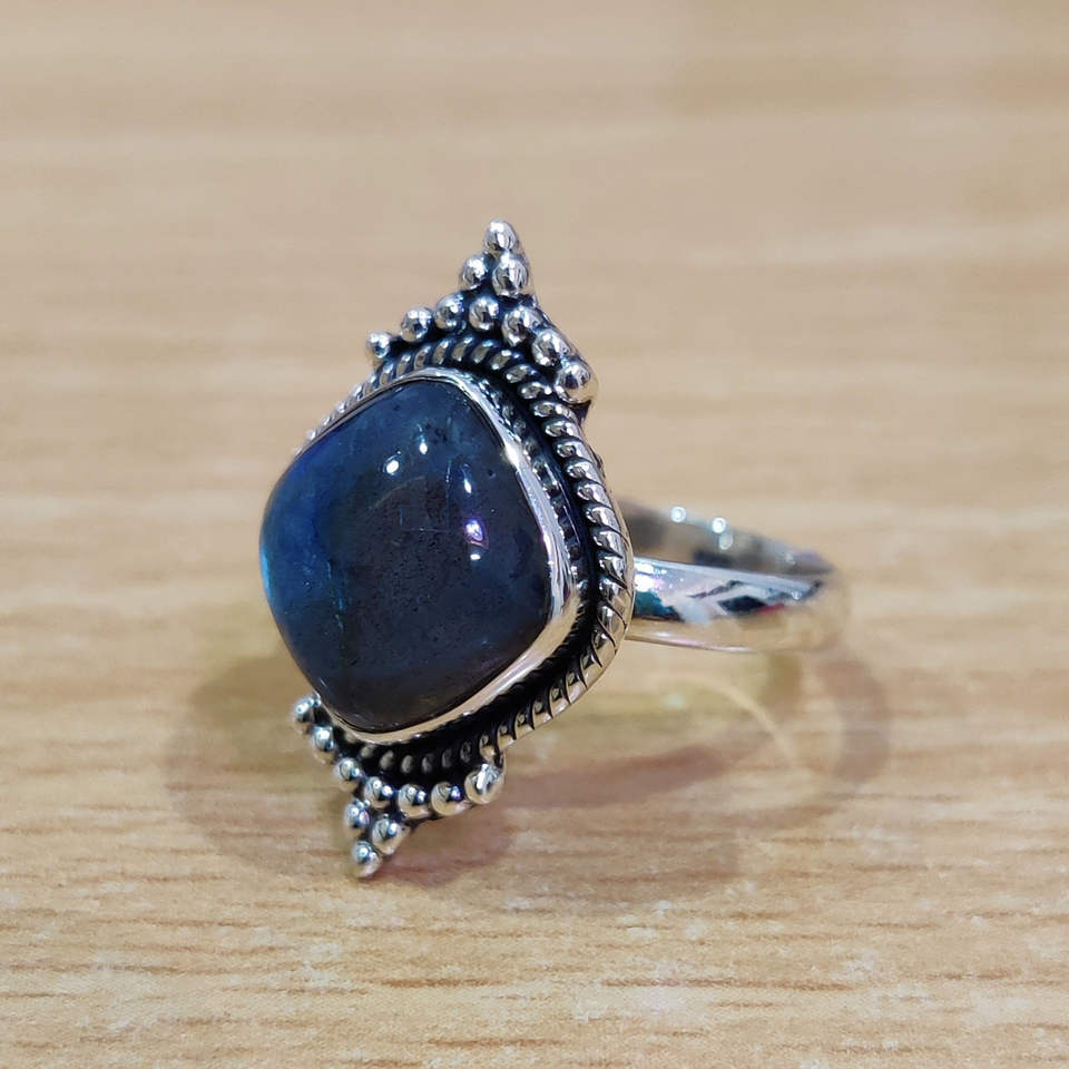 แหวนวินเทจแฟชั่นอัลลอยประดับพลอยลาบราดอไรต์ 4.2 กรัม ชุบทอง 18K แบบฝังขอบ ปรับขนาดได้
