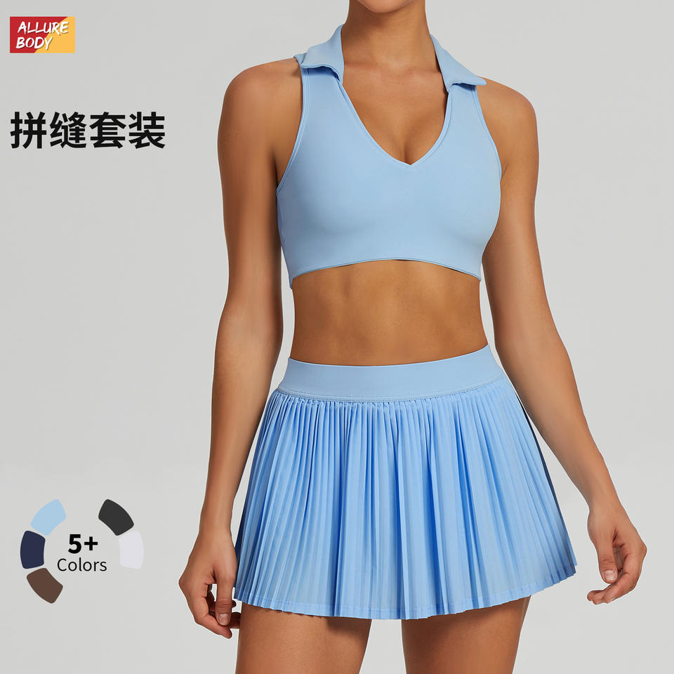 ชุดโยคะคอปกสีน้ำเงินสำหรับผู้หญิง Allure Body พร้อมกระโปรงจีบ ชุดออกกำลังกายสำหรับกิจกรรมกลางแจ้งในฤดูร้อน