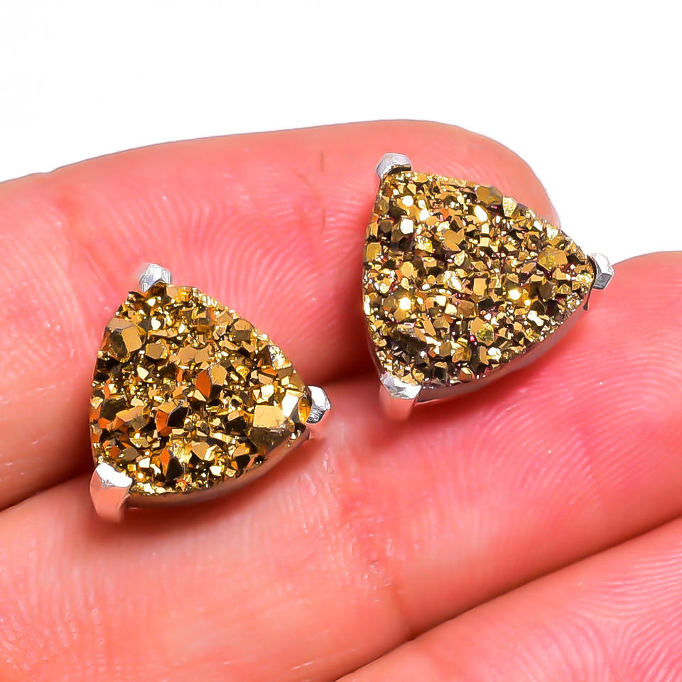 Alluring Golden Titanium Druzy Gemstone Fine Silver Jewelry 925 Sterling Silver Women's Gift Wedding Silver Plated Stud Earrings