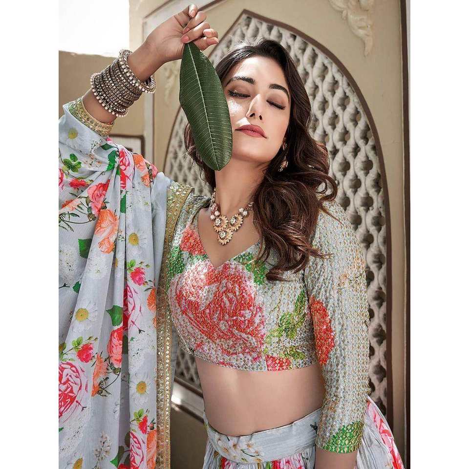 ชุดเลเฮนกาโชลีพิมพ์ลายดอกไม้สีฟ้าสดใสสำหรับผู้หญิง สวมใส่ในงานหมั้น
