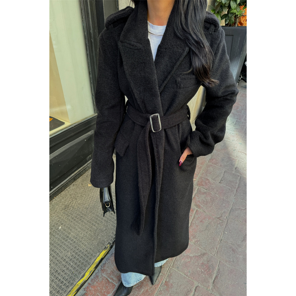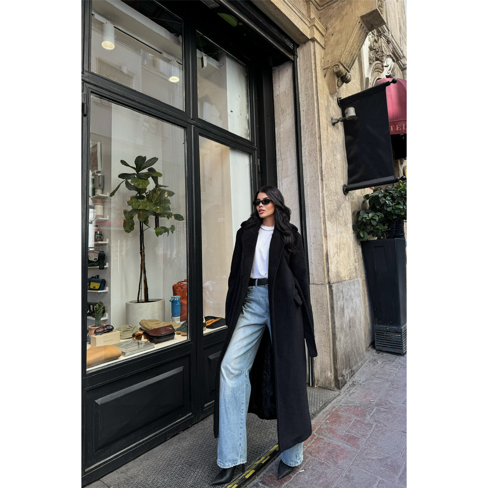 เสื้อโค้ทขนอัลปาก้าสีดำสำหรับผู้หญิง แขนยาว อุ่นสบายสำหรับฤดูหนาว ทรงยาว แฟชั่นเสื้อคลุม