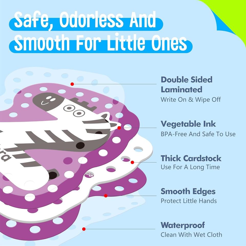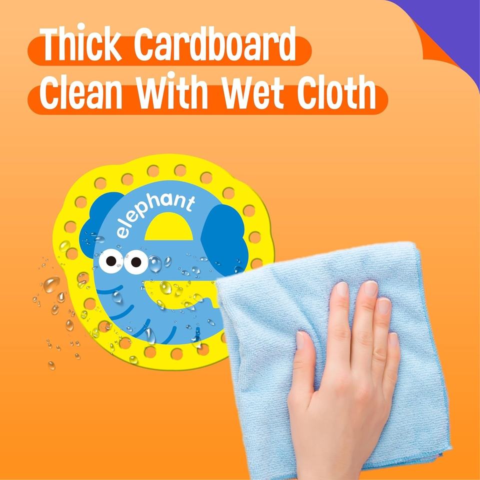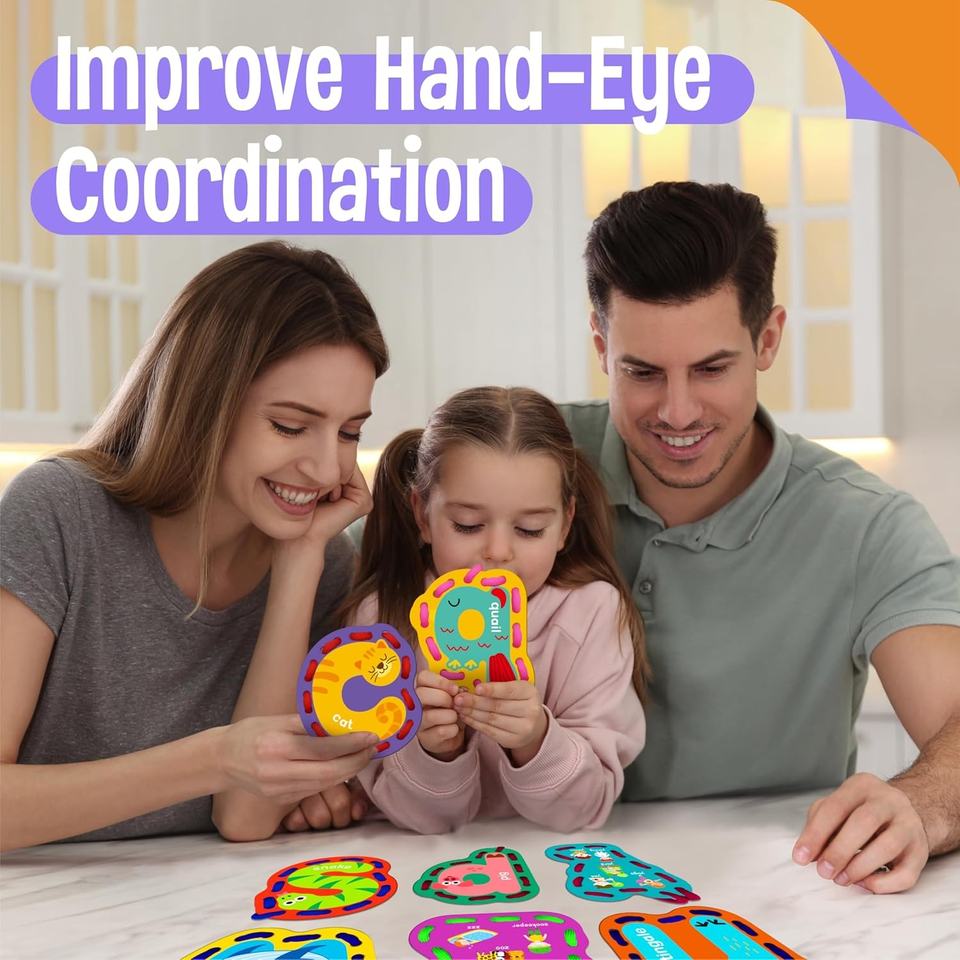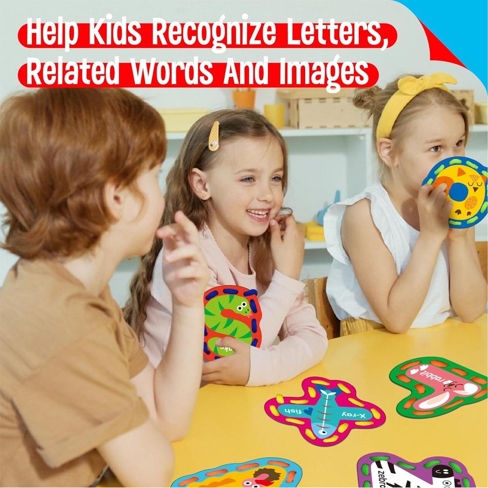 การ์ดตัวอักษรพร้อมเชือกผูก 26 สีสันสดใสสำหรับเด็ก ของเล่นเสริมการเรียนรู้ตัวอักษรและคำศัพท์แบบสองด้านสำหรับเด็กวัยหัดเดินและนักเรียน