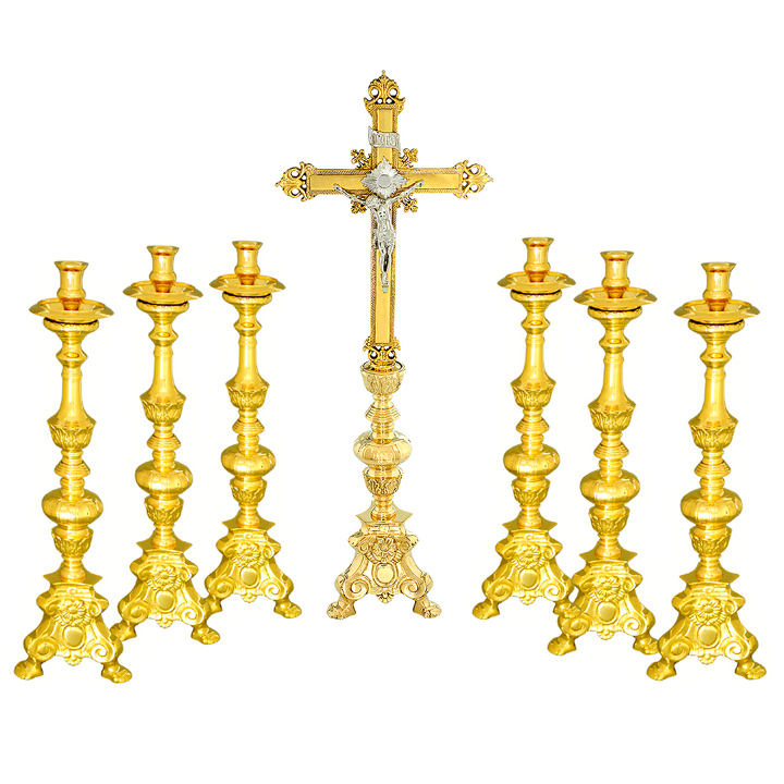 Altar Cross and Candlesticks Set of 7 Pieces | Brass Church Altar Set - DOUBLE VEE EXPORTS