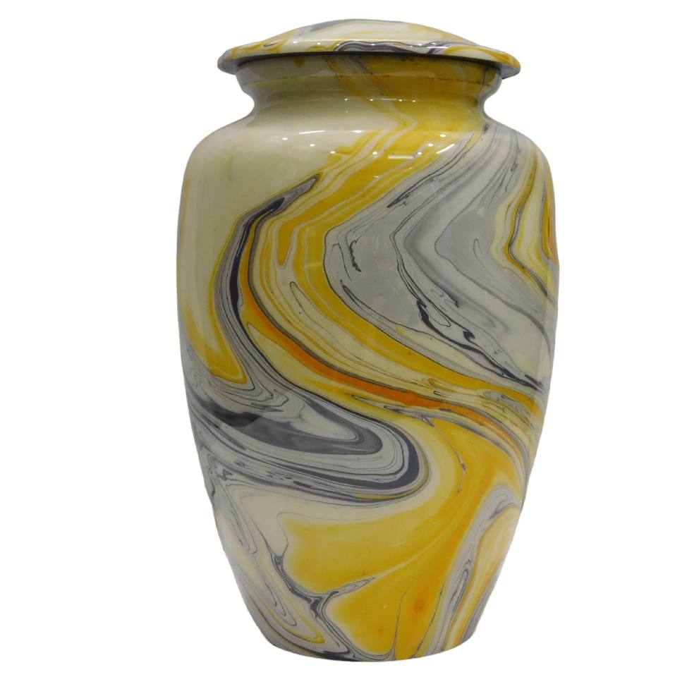 โกศเผาศพอลูมิเนียมสำหรับผู้ใหญ่พร้อมแถบสลักพิวเตอร์และเคลือบสีฟ้าสำหรับขี้เถ้าของมนุษย์