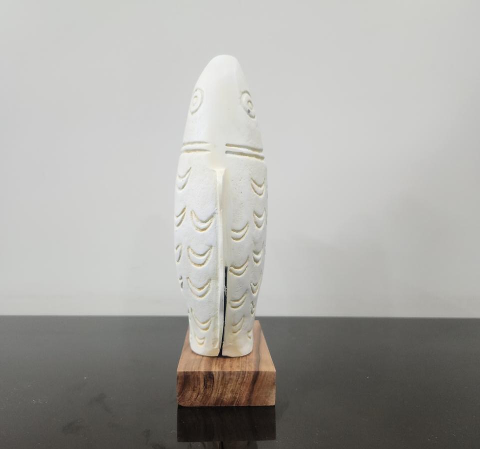 ประติมากรรมปลาอลูมิเนียมสีขาวที่ทันสมัยทำด้วยมือประดับโต๊ะชายฝั่งทำด้วยมือพร้อมฐานไม้สำหรับตกแต่งบ้าน