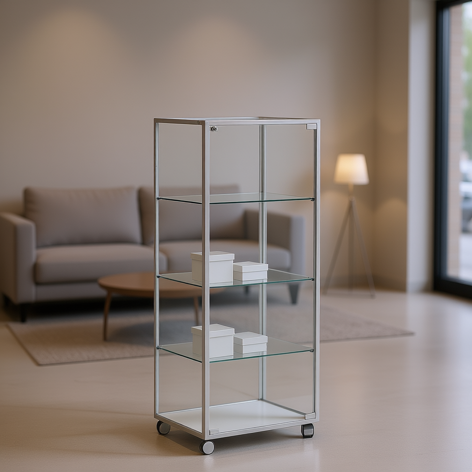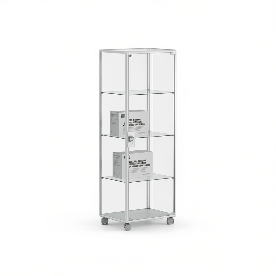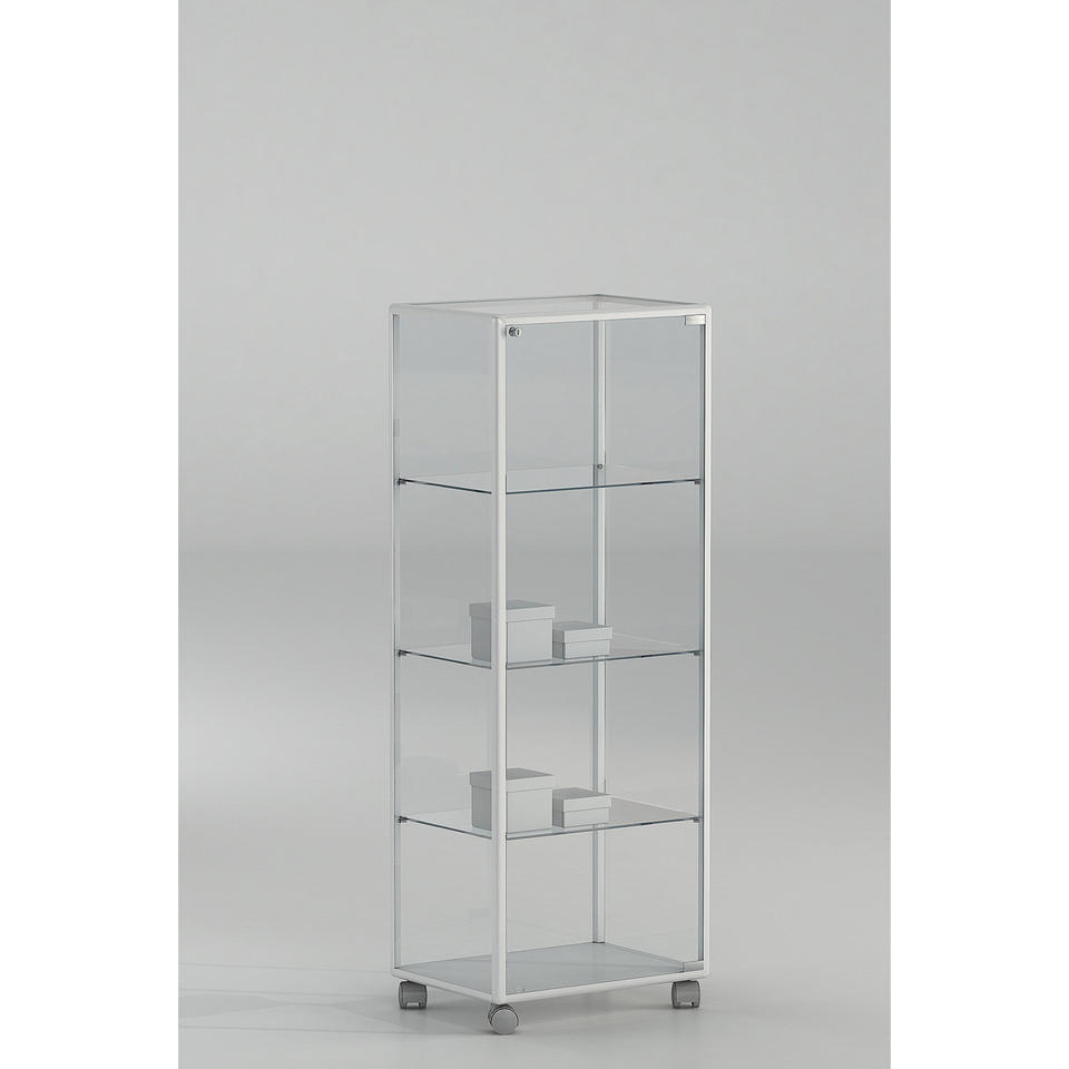 ตู้โชว์โครงอะลูมิเนียม 51x37x140 ซม. กระจกสีขาว พร้อมชั้นวางปรับระดับได้ และประตูล็อคได้