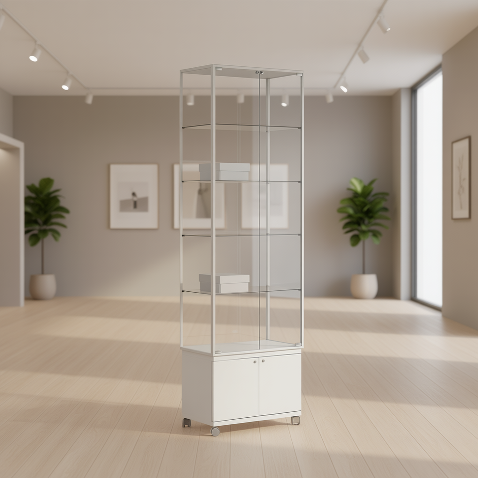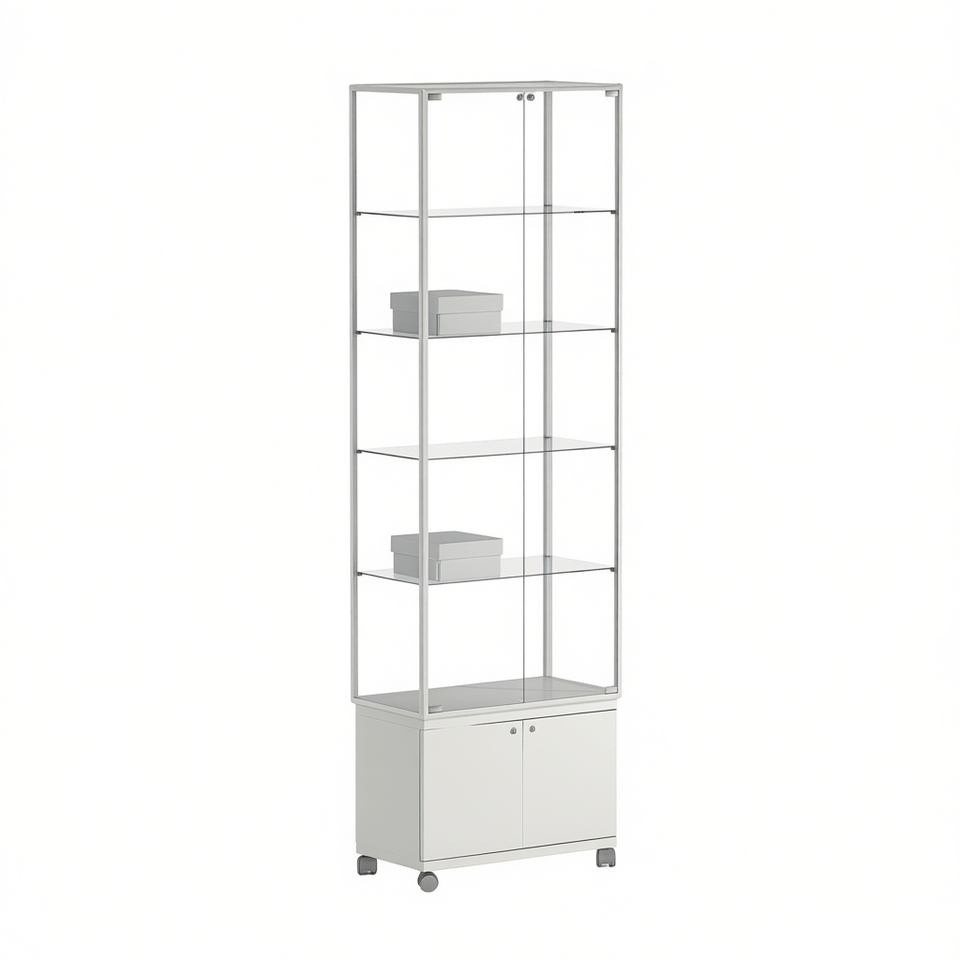 ตู้โชว์โครงอะลูมิเนียม กว้าง 95 ซม. สูง 220 ซม. พร้อมบานกระจกและชั้นวางปรับระดับได้ สีขาว