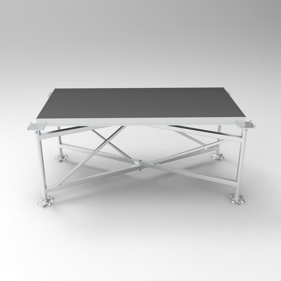 เวทีแบบโมดูลาร์ทำจากอลูมิเนียมอัลลอยด์ พื้นแบบพกพาเคลื่อนย้ายได้ พร้อมระบบเชื่อมต่อแบบสกรู รับน้ำหนักได้ 750 กก. ขนาด 1.22x1.22 เมตร