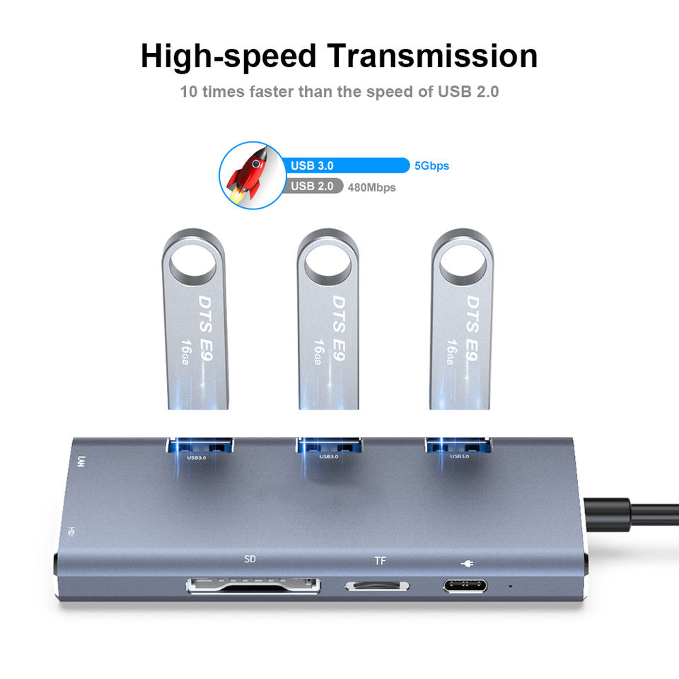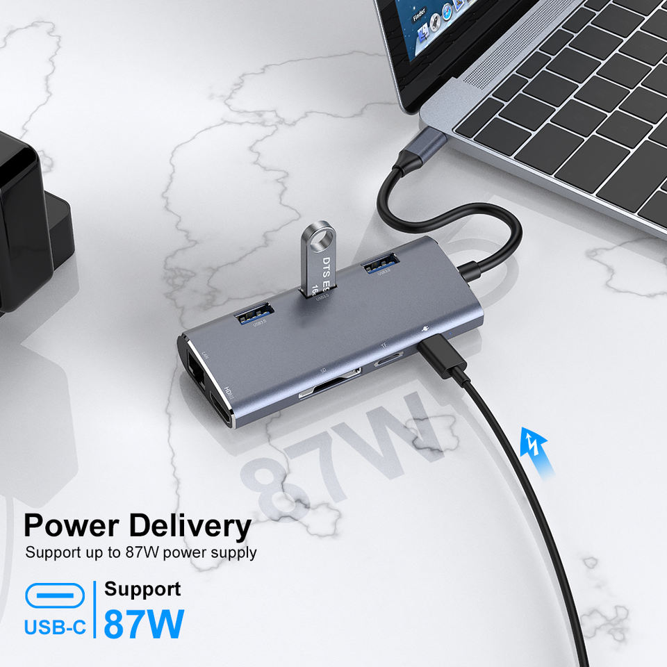 แท่นเชื่อมต่ออะลูมิเนียมอัลลอยด์ USB-C 8 พอร์ต พร้อมพอร์ต USB3.0 ช่องอ่านการ์ด SD TF พอร์ต Gigabit Ethernet รองรับการชาร์จ PD 100W หลายพอร์ต มีสินค้าในสต็อก