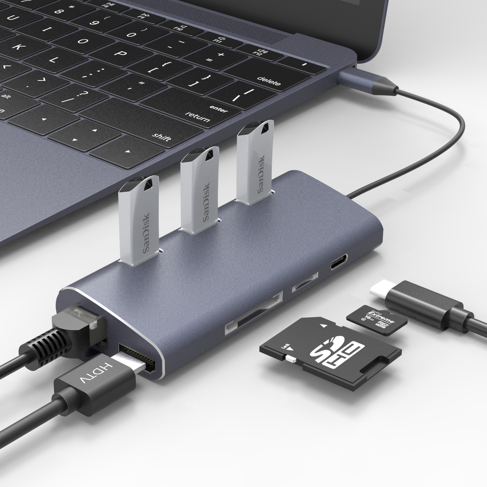 อะลูมิเนียมมัลติพอร์ตคอนเวอร์เตอร์ 8-in-1 พอร์ตฮับ