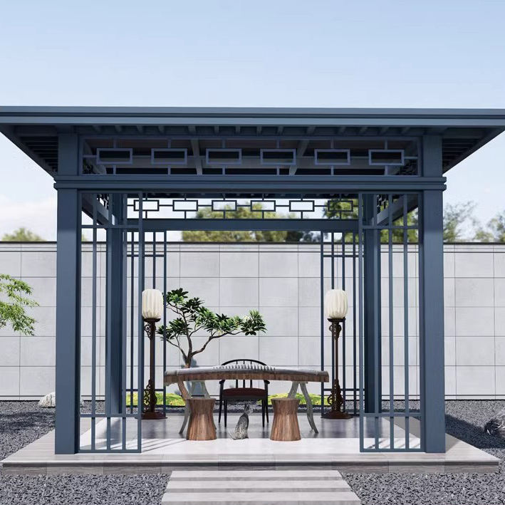 ศาลากันน้ำทำจากอลูมิเนียมอัลลอยสำหรับใช้ในสวนกลางแจ้งดีไซน์วิลล่าสไตล์จีนแบบใหม่มีที่บังแดดและมุมสี่มุม