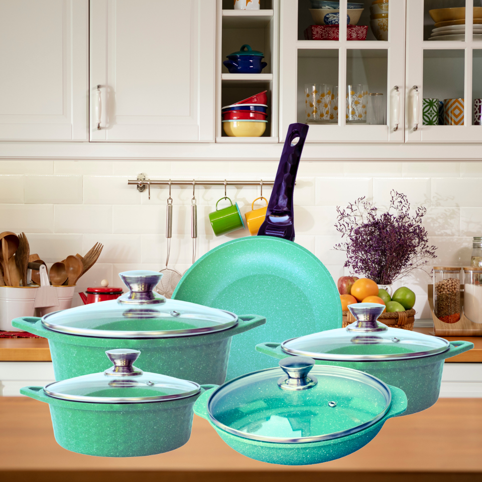 ชุดหม้อกระทะอะลูมิเนียมหล่อขึ้นรูปเคลือบเซรามิก ฝาแก้ว ทนความร้อน ใช้กับเครื่องล้างจานได้ เป็นมิตรกับสิ่งแวดล้อม ใช้ได้กับเตาทุกประเภท