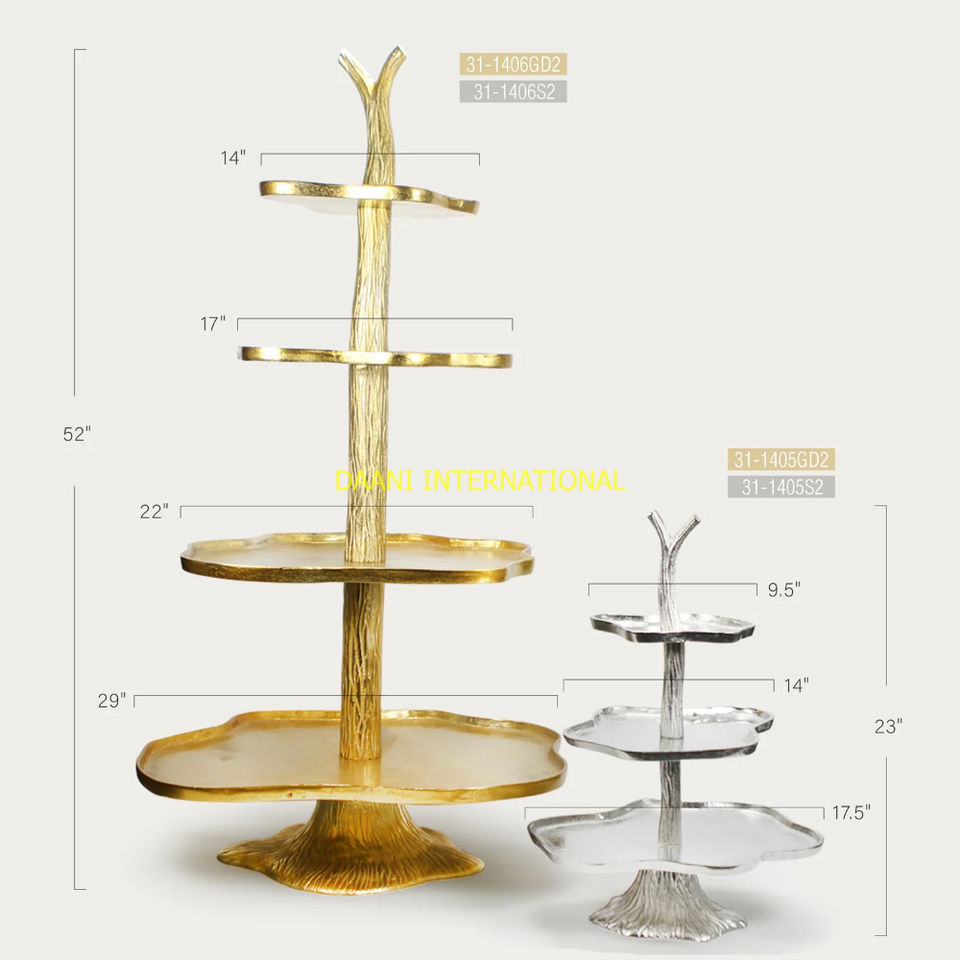 แท่นวางเค้กอลูมิเนียมสีทอง3ชั้นดีไซน์ต้นไม้หรูหราสำหรับวางขนมหวานสำหรับงานแต่งงานโรงแรมงานจัดเลี้ยงอาหารงานอีเว้นท์บุฟเฟ่ต์