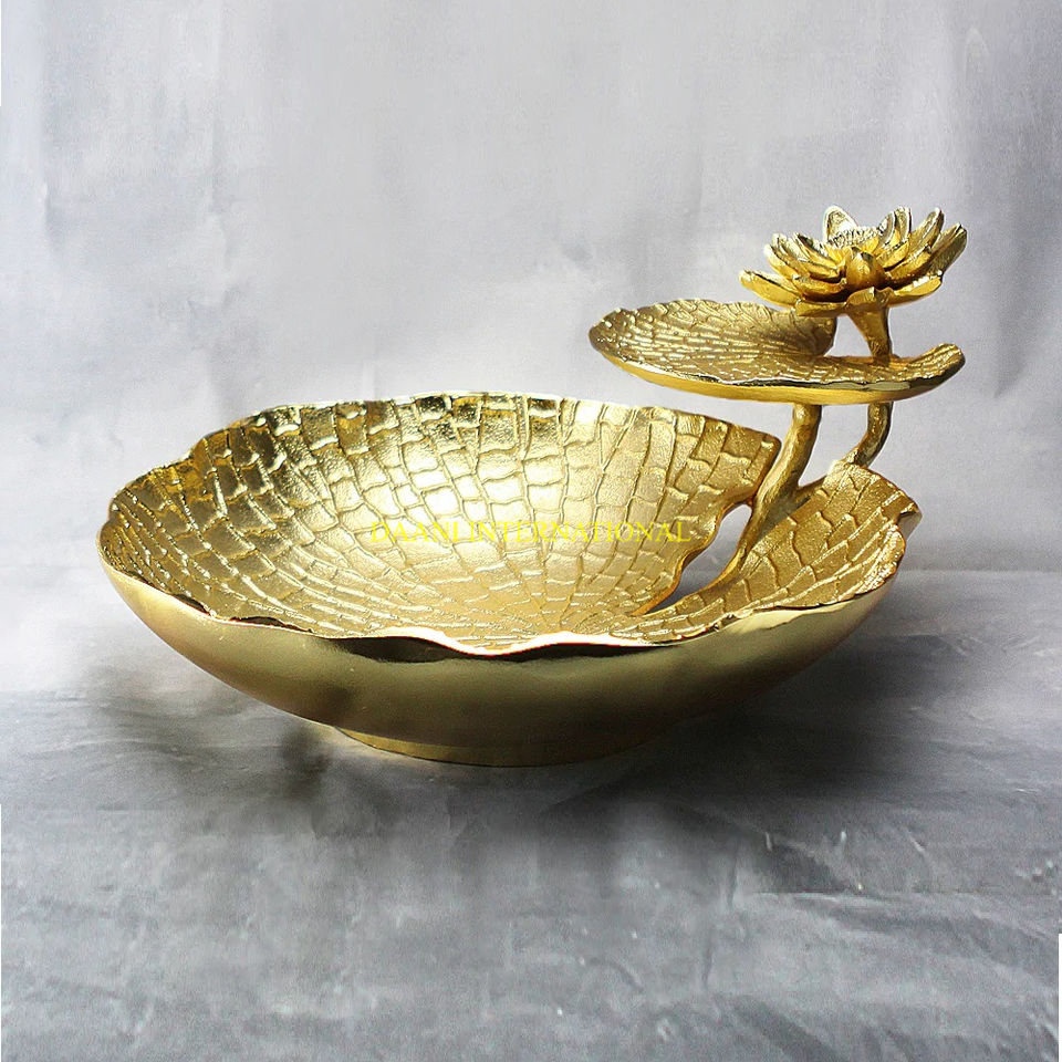 จานดอกบัวอลูมิเนียมสีทองและแบบจุ่มสำหรับตกแต่งจานเสิร์ฟพร้อมดีไซน์ใบไม้หรูหราสำหรับงานปาร์ตี้กลางและของขวัญ