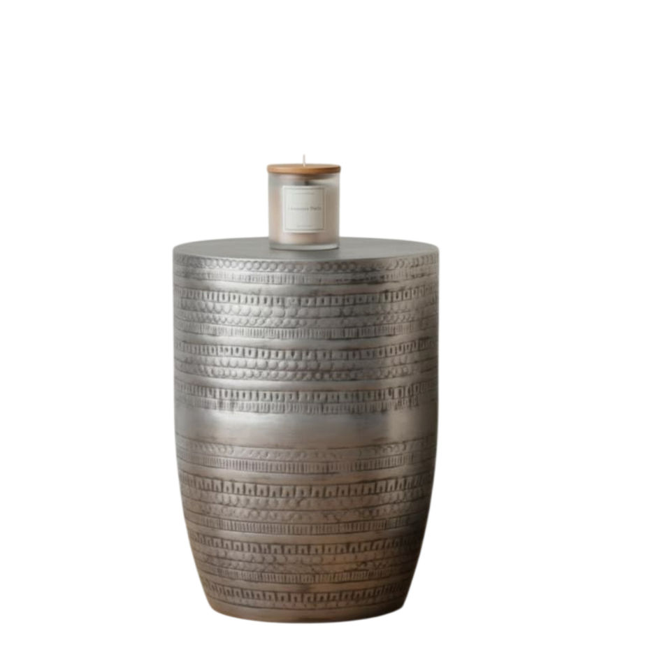 Aluminum Metal Accent Side Table Handcrafted Round Drum Stool With Unique Antique Silver Textured Finish For Living Room Bedroom