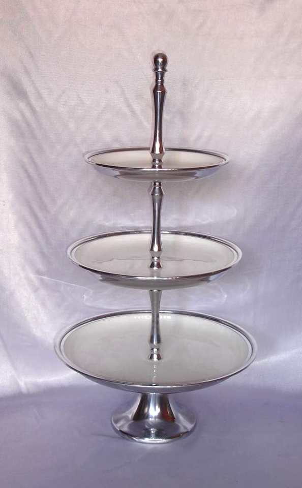 อลูมิเนียมชุบนิกเกิล/เงาโปแลนด์แฟนซียืนเค้กชายแดนโค้งสไตล์ที่ทันสมัยหรูหราพระราช3ชั้นยืนเค้กจาน3ชั้น