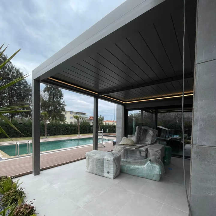 เพอร์โกลาอะลูมิเนียมแบบพับเก็บได้พร้อมหลังคาบานเกล็ดสำหรับพื้นที่ใช้สอยกลางแจ้งสมัยใหม่