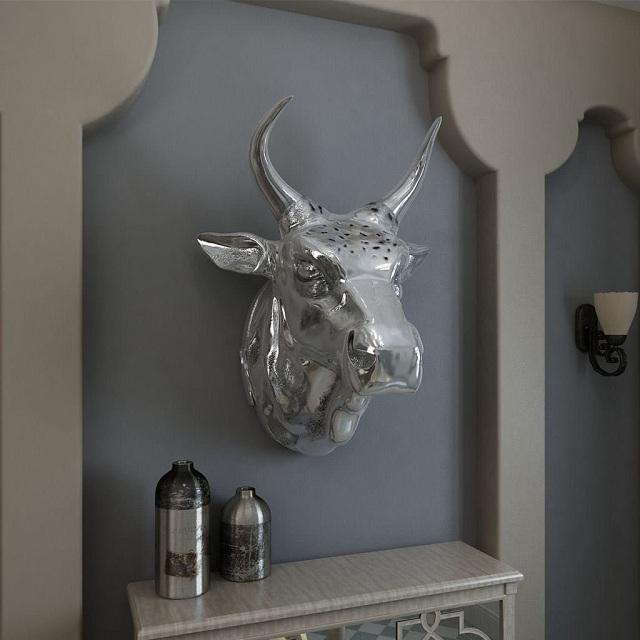 งานประติมากรรมโลหะรูปหัววัวติดผนัง ดีไซน์อาร์ตเดโค ทำด้วยมือ วัสดุอะลูมิเนียมสีเงิน สำหรับตกแต่งผนังห้องนั่งเล่น