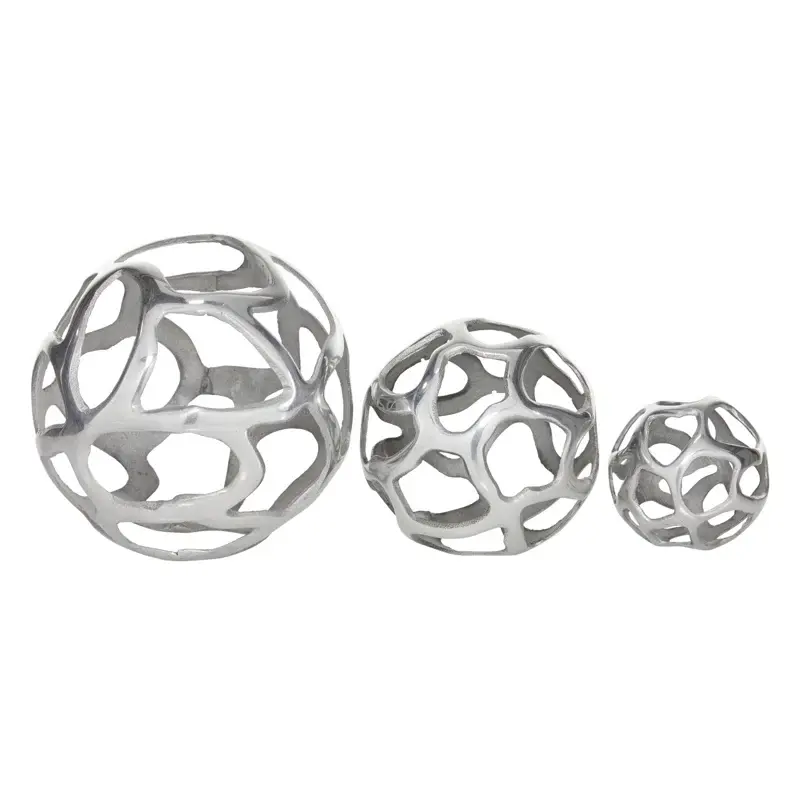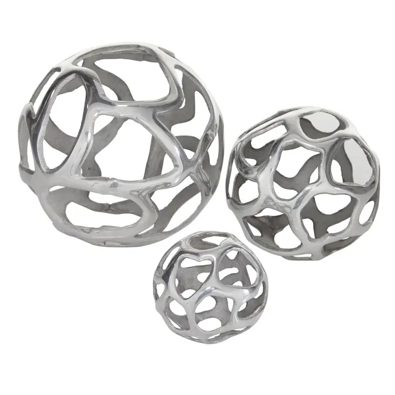 ประติมากรรมทรงกลมอลูมิเนียมสีเงินทรงกลมสำหรับตกแต่งรูปปั้นอลูมิเนียมขัดเงาทันสมัยตกแต่งด้วยโลหะรูปทรงเรขาคณิต